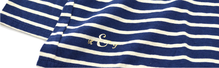 ボーダーの生地を縦横変化をつけてデザインしています。 左裾部分をフレアーにしているので、着ると少しだけ落ちたラインで女性らしいです。 ボーダーカラーもシンプルで切り替えていますが馴染んでいます。裾にキラッと光るプリントを入れているのがポイントです。