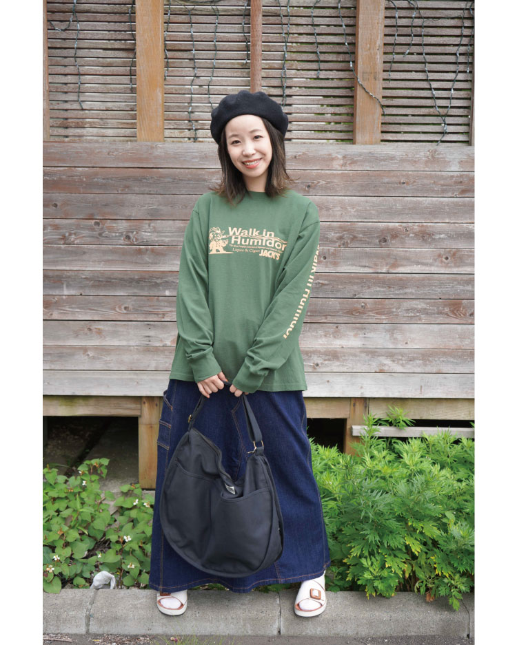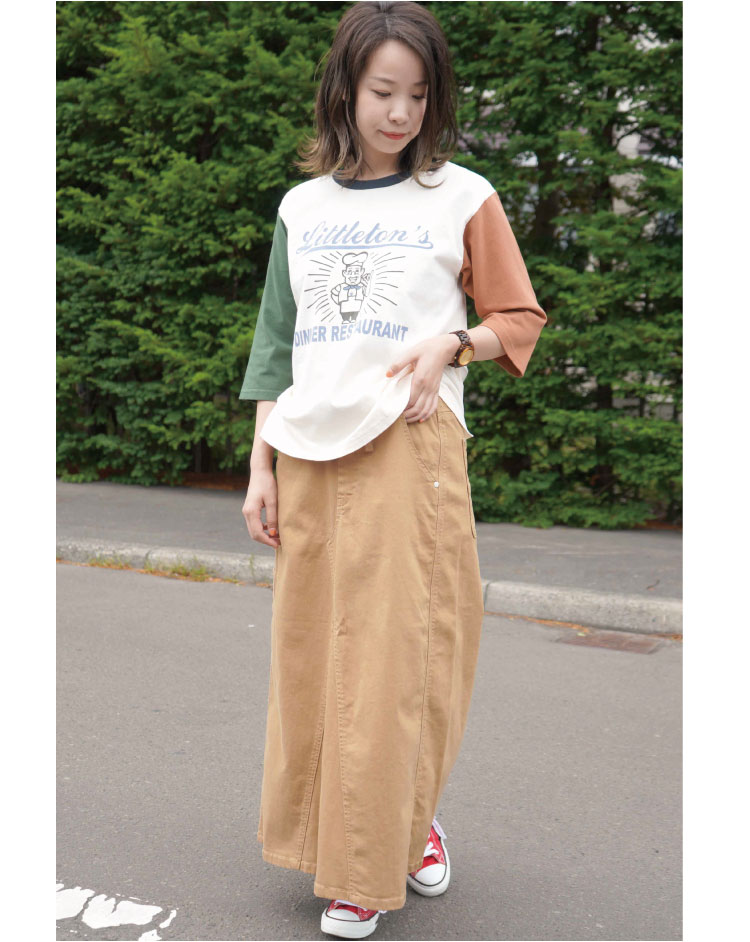フロントに大きくプリントされたシェフのイラストが目を惹くユニークでポップなアメリカンロゴTシャツ。裾は後ろ下がりのラウンドライプで、袖丈はヒジの隠れる半端袖。ボディラインが出ないよう程よくラフなサイジング。ドライな質感と丈夫な風合いが特徴の空紡糸天竺を使用したコットン100%で肌触りの良いさらっと快適な着心地の生地となっています。