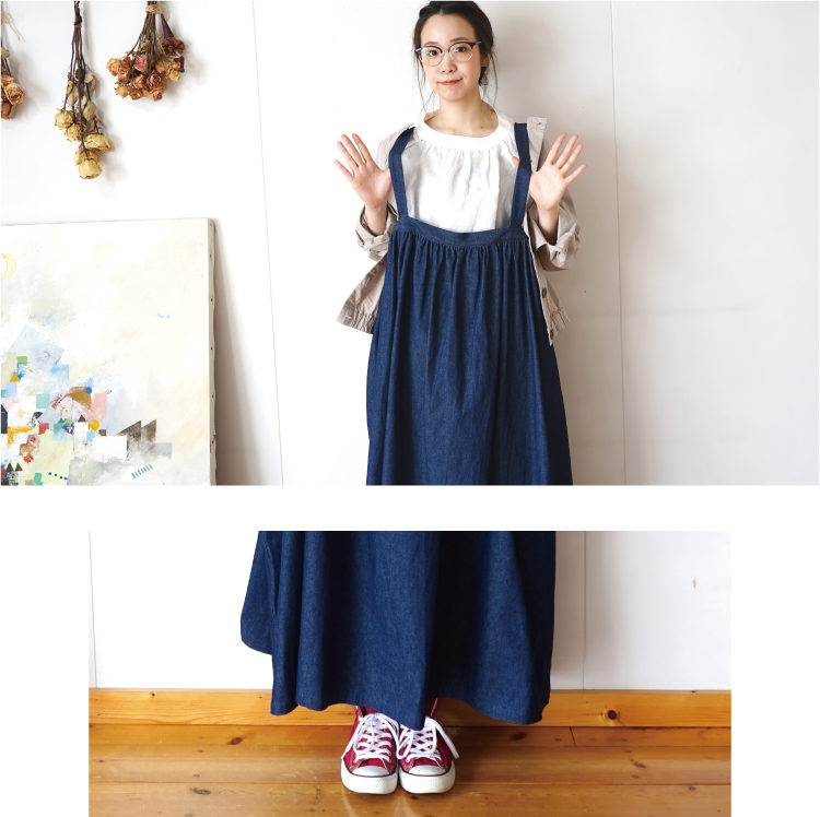 ボリュームたっぷりのギャザージャンパースカートでデニム素材なのでインナーによっては、年中使えます。肩ひもは、4段階調整可能です。