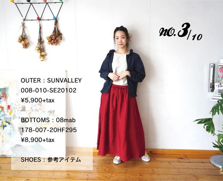 徐々に気温も上がり、春の陽気になってきている今、08mab , SUN VALLEYなど人気ブランドのおすすめアイテムをナチュラルなコーディネートでご紹介します。