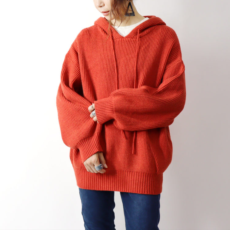 7ゲージのしっかりとしたニットを使用し、ボリュームのある袖やフードが特徴のパーカー型ニット☆