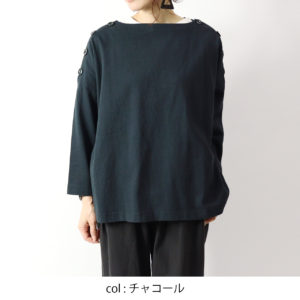 広めのボートネックでインナー次第で印象を変えられるのが特徴。
