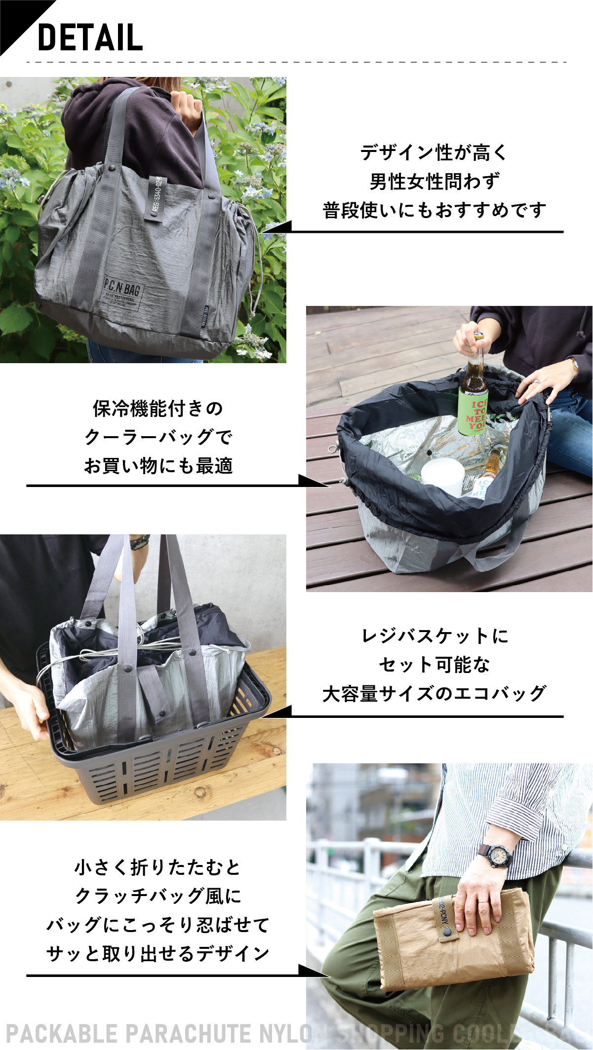 毎日使いたくなるような手触りのパラシュートナイロン生地のエコバッグ。