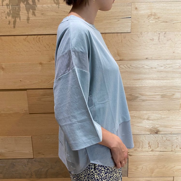 秋らしいカラーリングがポイントの布帛コンビ5分丈のTシャツ。