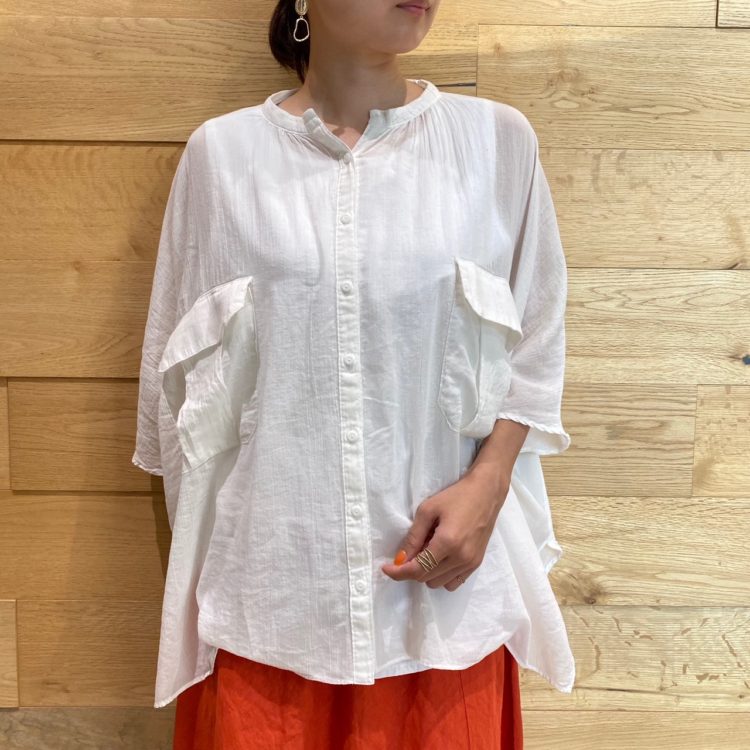 バックにレター配したゆったりドルマンボディーに、バンドカラー