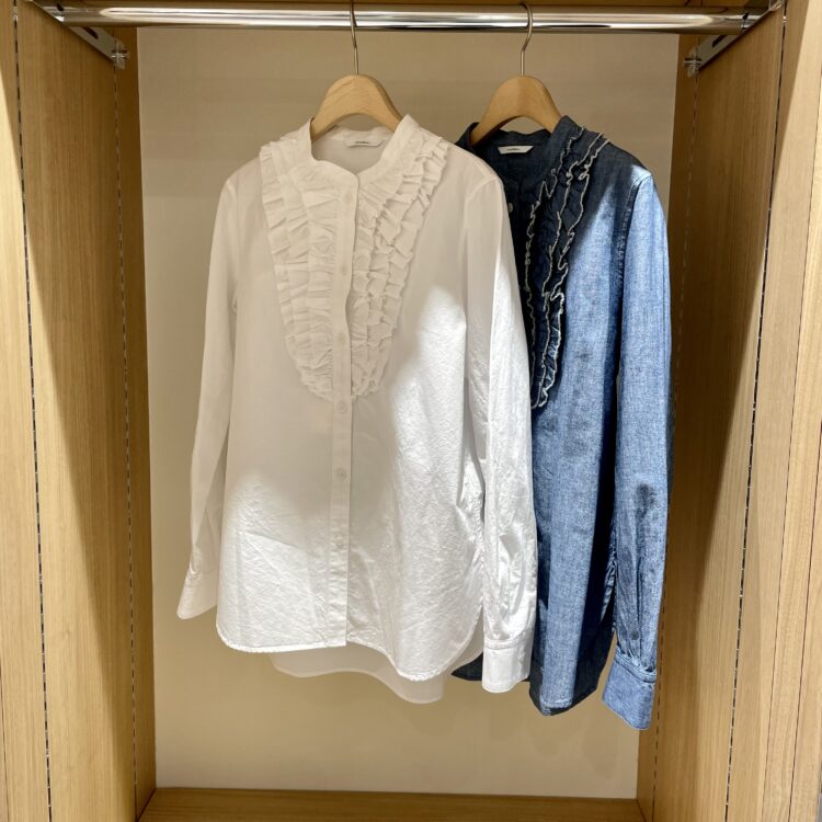胸元にフリルをあしらった、上品さとカジュアル感を両立しているシャツです。
