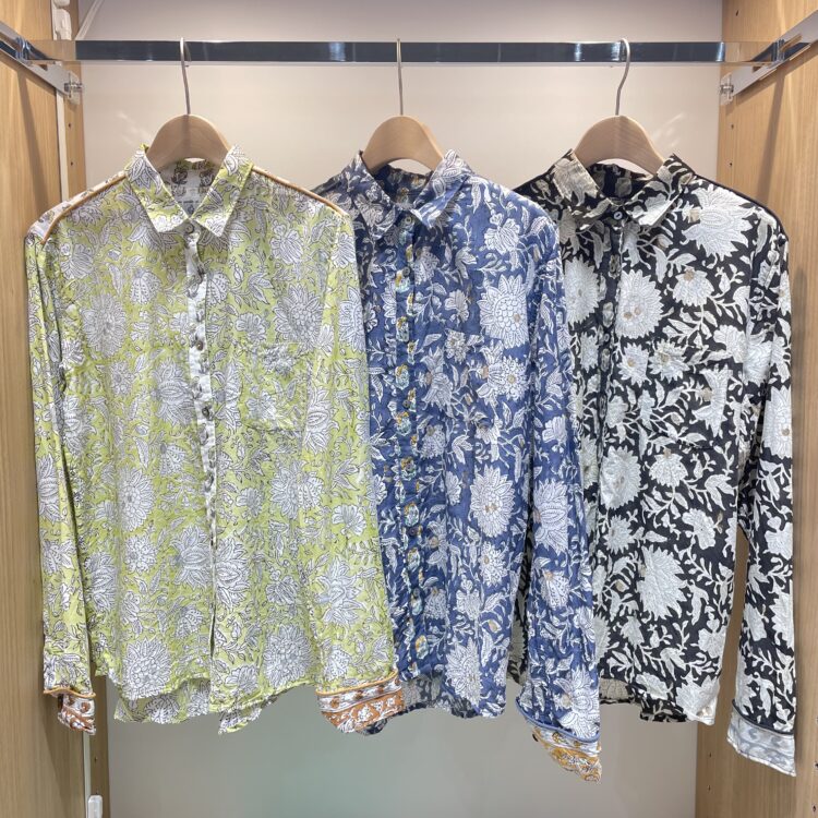 インドの手仕事、2種の花柄を切替使用したハンドブロックプリントが素敵なレギュラーシャツ