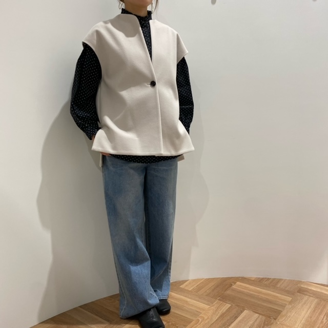 このベスト、意外とデニムなどカジュアルなスタイルとも合うんです!!キレイめのデニムを合わせることでカジュアルすぎず、大人っぽく着こなせます!!