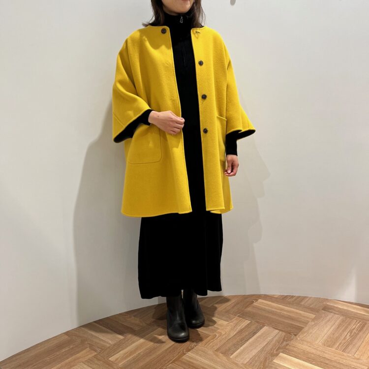 ノーカラーのコートはワンピースとしても着こなせる1枚。季節の