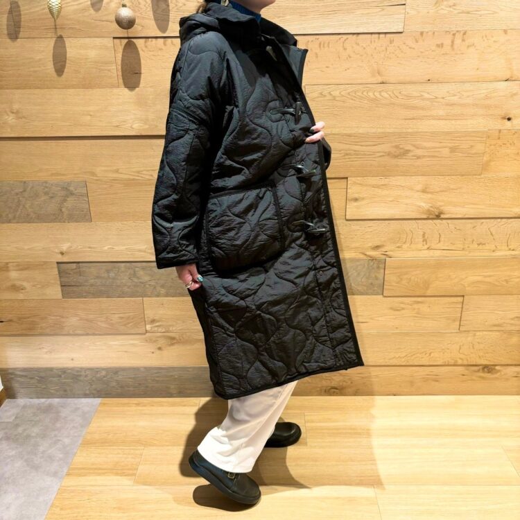 ミリタリーキルト素材をベースにダッフルコート のディティールを組み合わせたインパクトのある一着です。