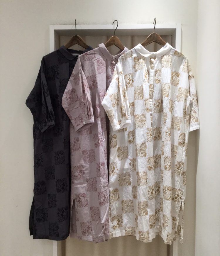 ▼ 綿麻総柄刺繍7分袖シャツワンピース