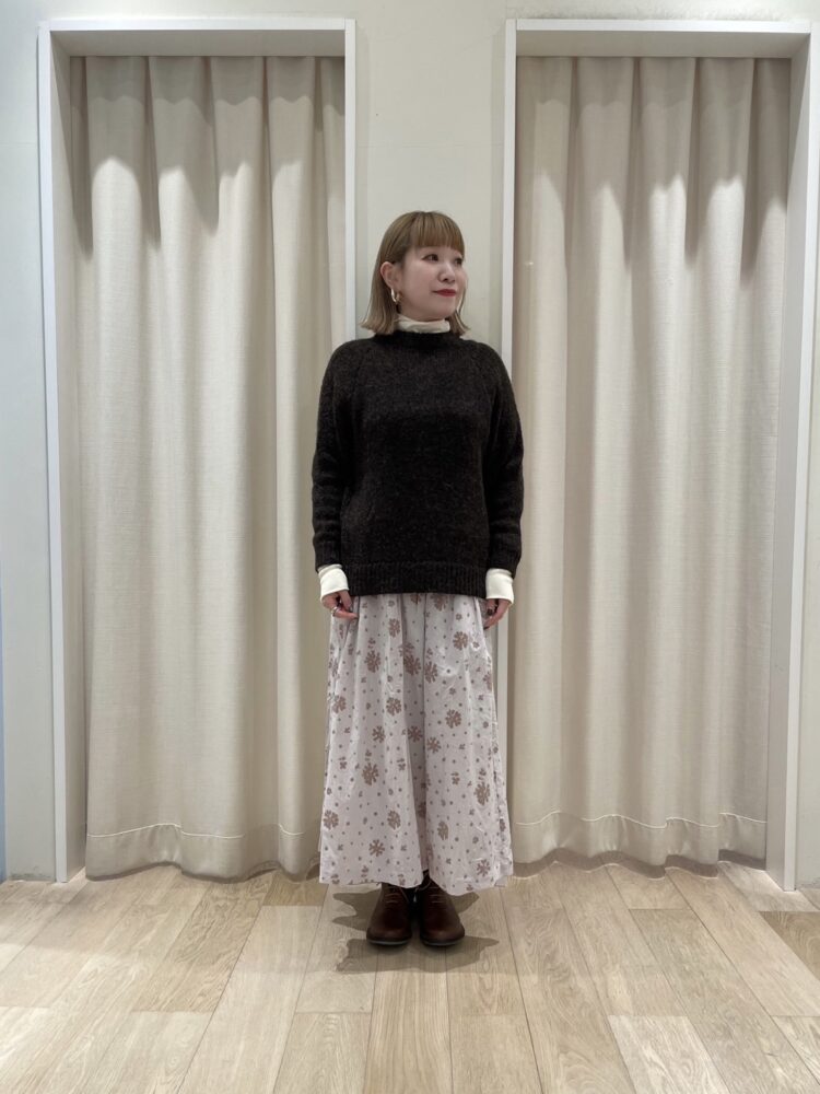 ブラウンのニットで引き締め、