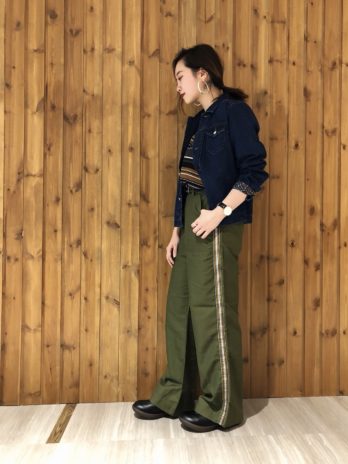 横のラインが特徴的なワイドパンツ。