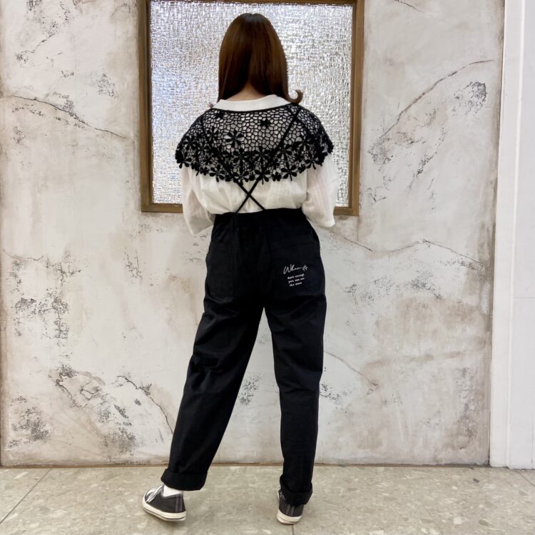 ウエストから後ろの紐は1本で繋がっており、長さによって着方やシルエットを変えることも可能なサロペットです😮!