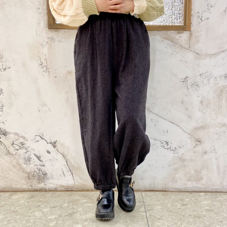 ウエストは総ゴムで、素材は綿麻です!