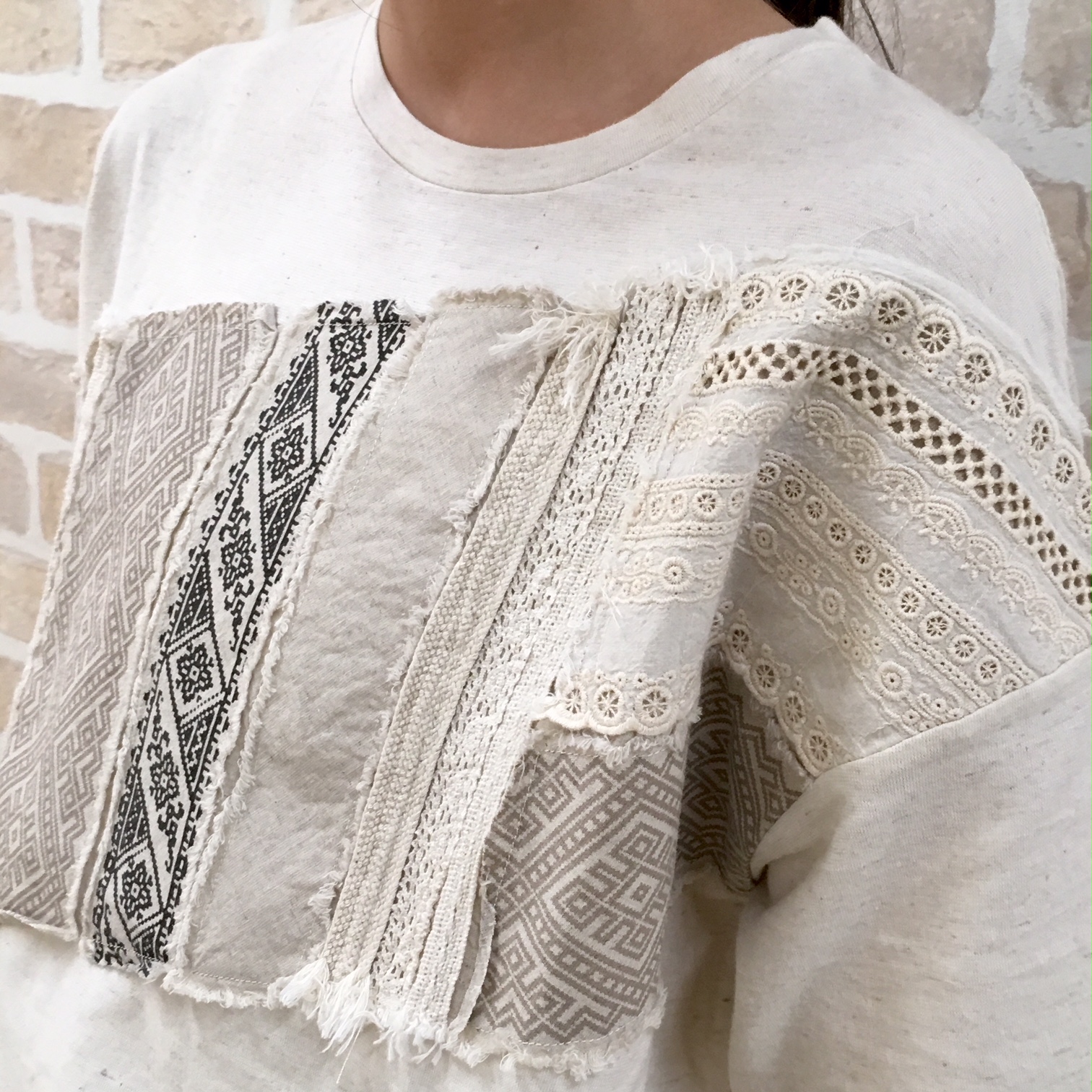 幾何学模様のパッチワーク&デザインの異なるレースをふんだんにあしらったTシャツになります!