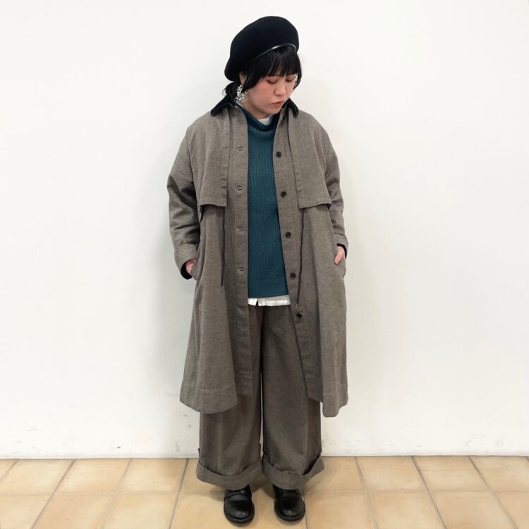 ボトムはコートと同じ生地で仕立てられたワイドパンツ。
