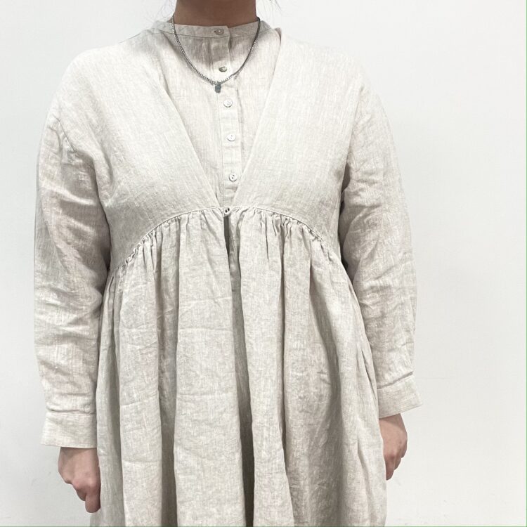 ヘンリーネック側はウエスト部分のボタンを留めるとVラインが現れ、グッとギャザーが引き立つルックスに◎