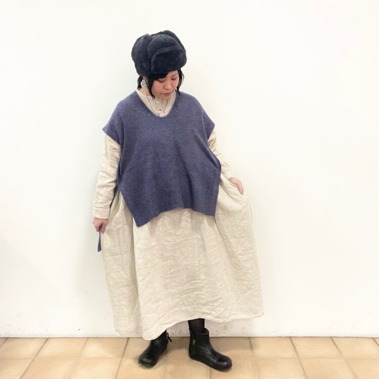 アームホールが広くあいているので、ドルマンスリーブなどの太い袖のトップスとの合わせも◎