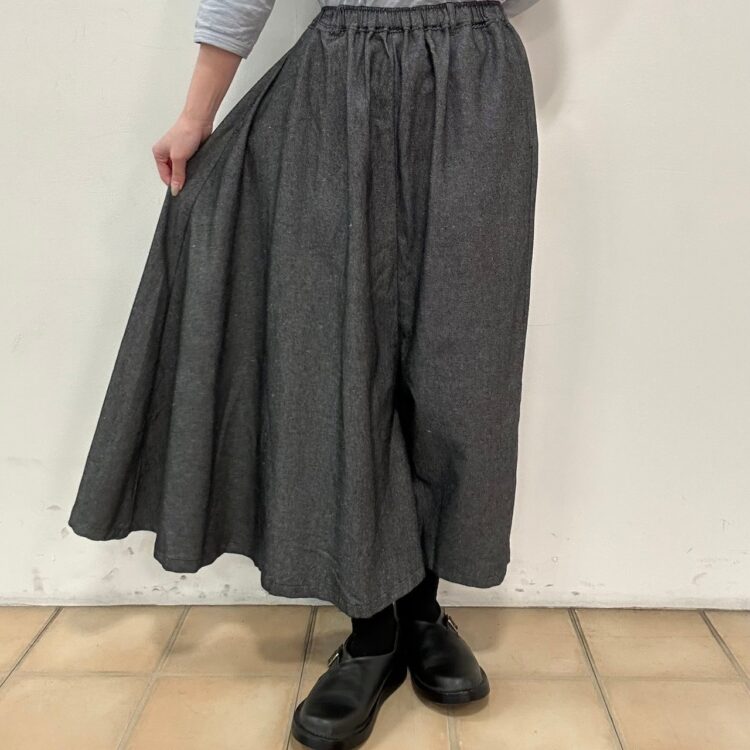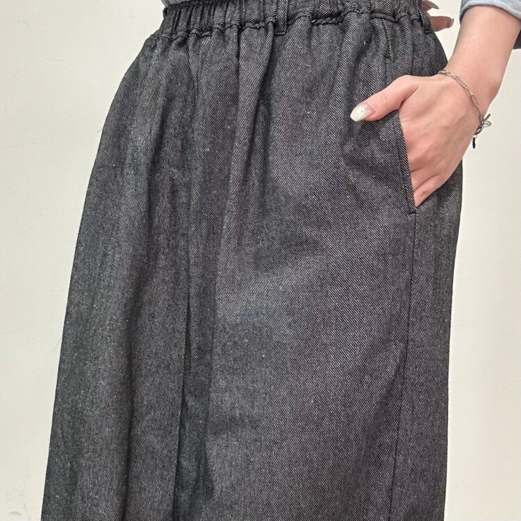 まるでスカートのように優雅な形が目を惹く、存在感たっぷりのデニムパンツです。
