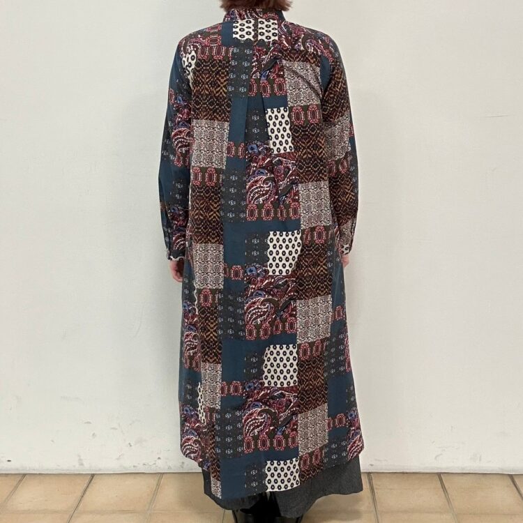パッチワーク柄プリントが素敵な、前ヨーク切替の前開きワンピース。