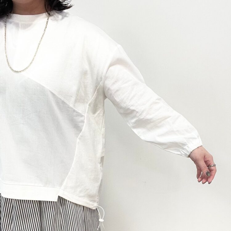 フロントのアシンメトリーな切替デザインが特徴の一枚。