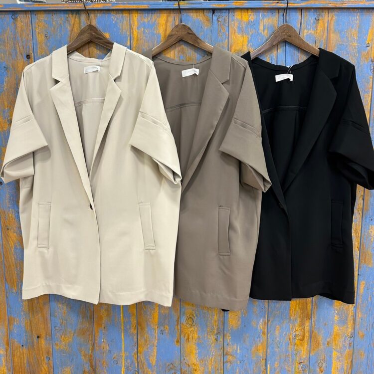 Tシャツとコクーンシルエットのパンツにジャケットを合わせて、