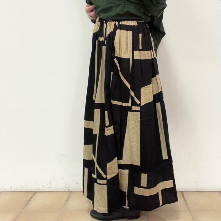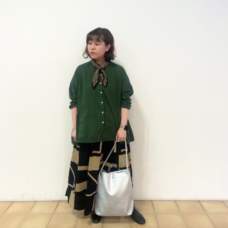 深いグリーンカラーのブラウスに、ブラック×ベージュの柄スカートを合わせてみました☺