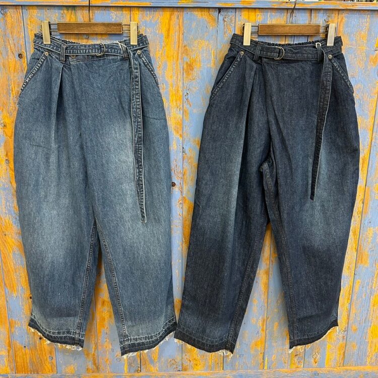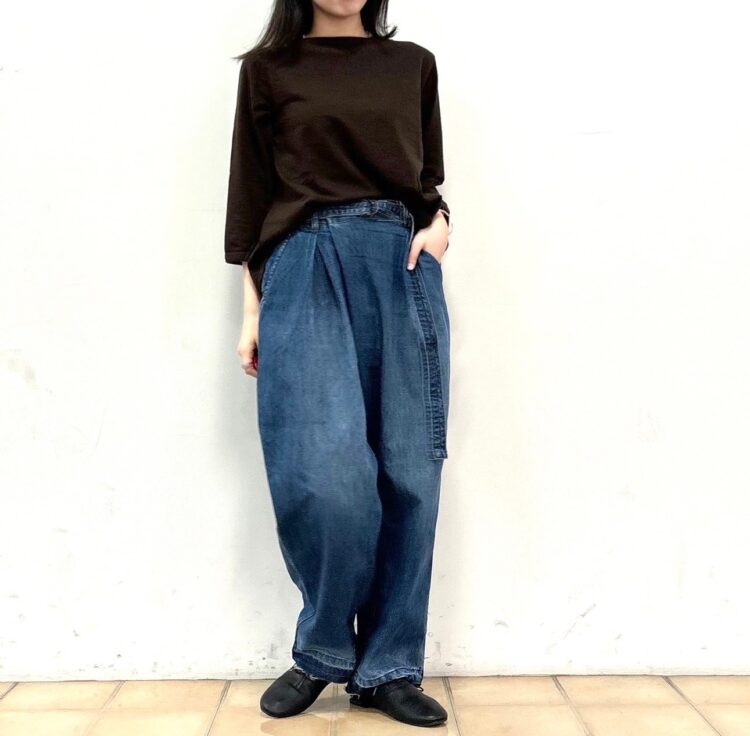 腰回りの丸みあるシルエットと長めのベルトが見えるタックインスタイルでの着こなしもオススメです!