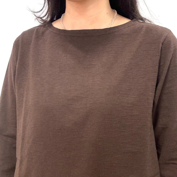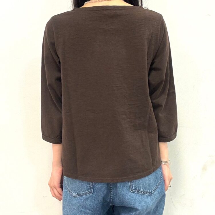 七分のスッキリ袖に、ボートネックのシンプルデザイン。首元開きすぎずインナーにもぴったりな一枚。肩ラインぴったりしすぎず肩幅広めさんも着やすい一枚です✨