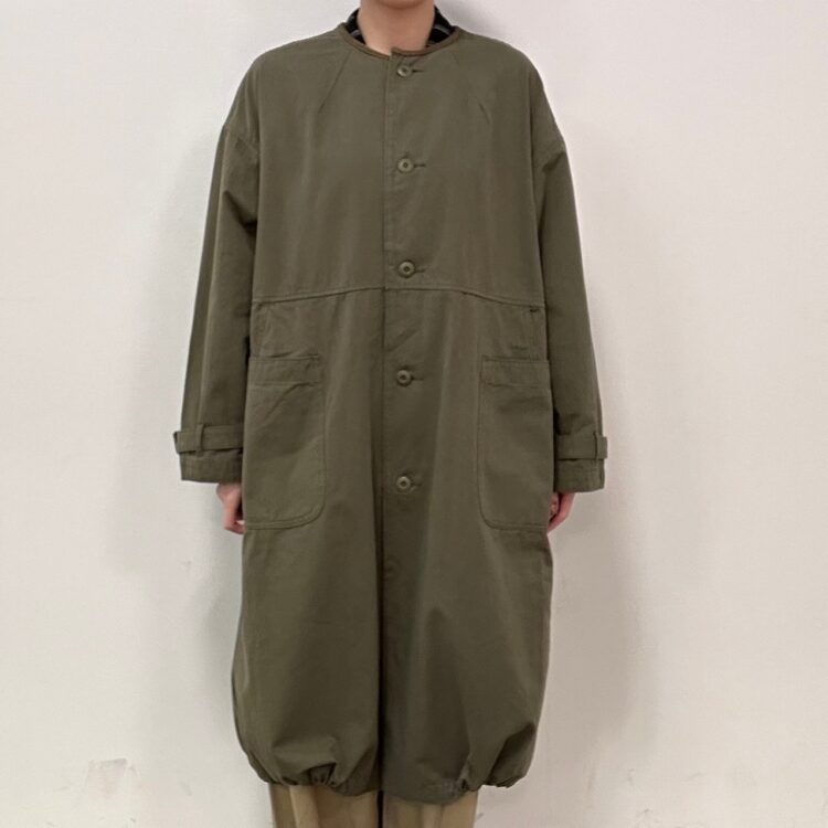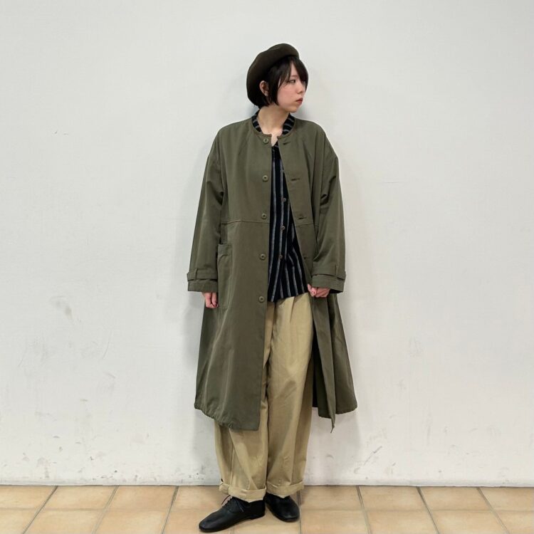 1枚仕立てのノーカラーコートになっていて、今時期からインナー次第で長く着て楽しめます🎶