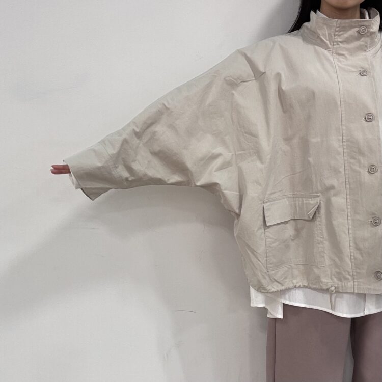 大きなドルマンシルエットにスタンドカラーで、カジュアルで抜け感のある大人かわいいデザインです。