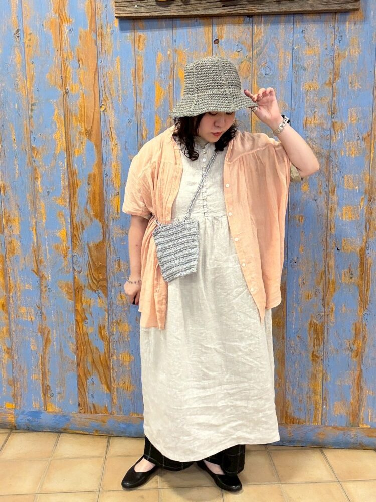 《08Mab》のリネンワンピースに、夏らしくキレイなオレンジカラーのシャツを合わせました✨