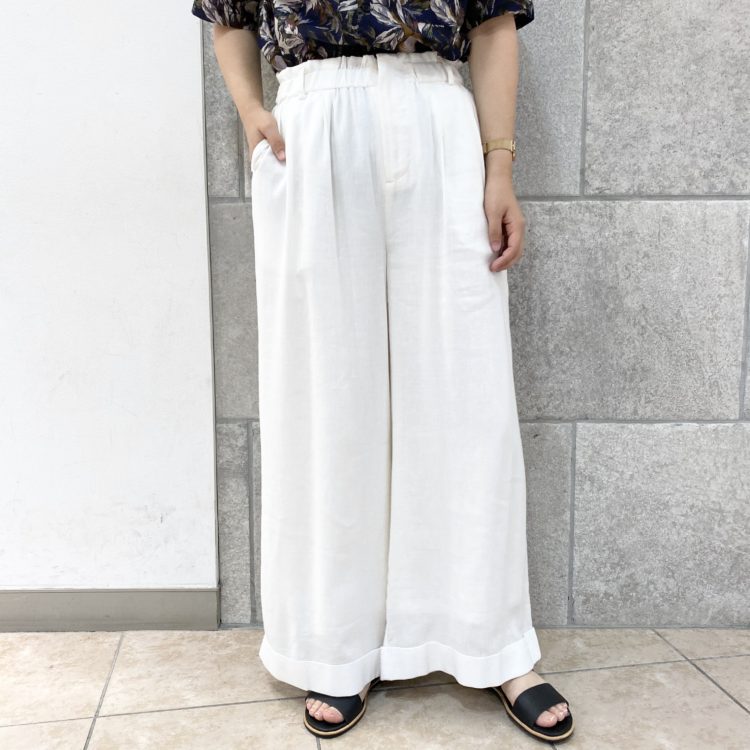 ボイル特有のふわっとした肌触りとシルエットが涼し気な印象です。ウエスト周りはゴム仕様で紐付きとなっております。