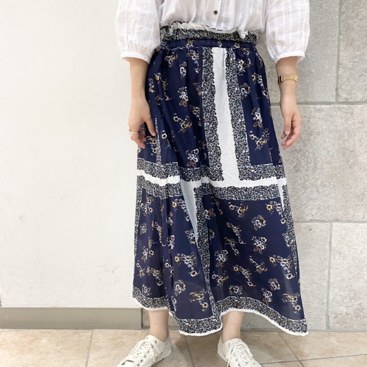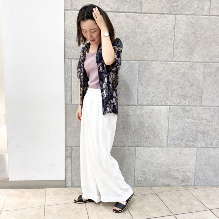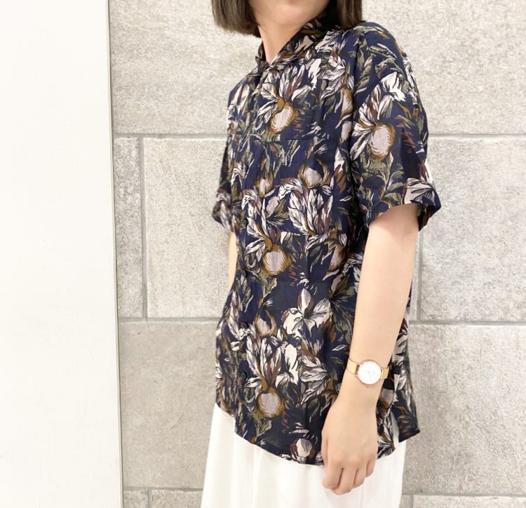 ヴィンテージ風な色使いと花柄模様が大人っぽさと、どこかマニッシュな雰囲気にもなっている一枚。