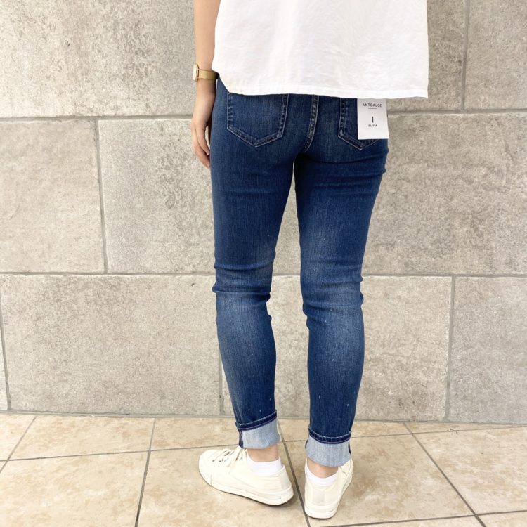 アントゲージオリジナルデニム生地は驚くほど伸びるストレッチ性とキックバック性を実現しています。