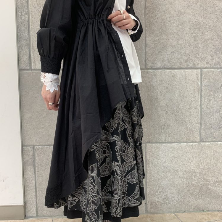 チュニックの大胆な後ろ下がり方。流れるような美しいラインを活かして、あえてのフワッとボリュームスカートで合わせてワンピース風に仕上げました♪ フワッとしたチュニックに、フワッとしたスカート、そして袖からはレースのインナーをチラ見せ!