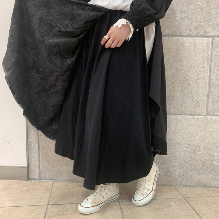 ロング丈のパーカーにスカートのスタイリングは、今年齢問わずに人気のコーディネートです◎是非!挑戦してみて下さい^^