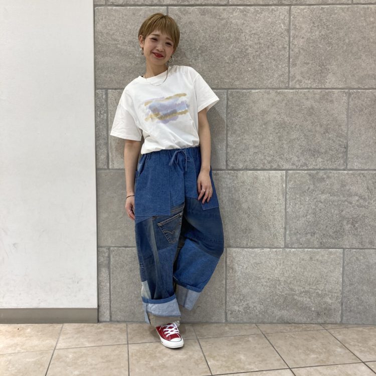Tシャツにデニムっていうかなりスタンダードな合わせなのですが、遊び心のあるパッチワークのパンツがいい仕事してくれています!!
