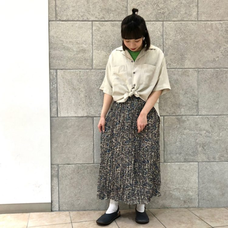 花柄のプリーツスカートを合わせることで女性らしさ◎ストンとそのまま着るのも良いのですが、、