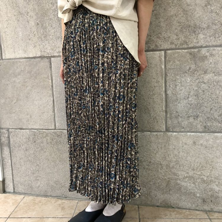 細プリーツでシルエットが綺麗なこちらのスカート。小花柄が上品で色合いも大人っぽいので“可愛らしすぎず”に着られますよ。