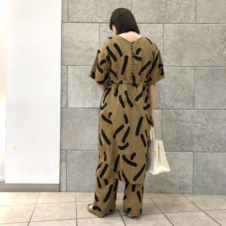 柄物セットアップは着るだけでお洒落に!大振りな柄に落ち着いた色合いなので、上下で着てもうるさく見えません。ゆるっとしたワンピースにゆるっとしたパンツを合わせているのが大人っぽい♩小物に白やラメを入れて春夏らしさを取り入れました。