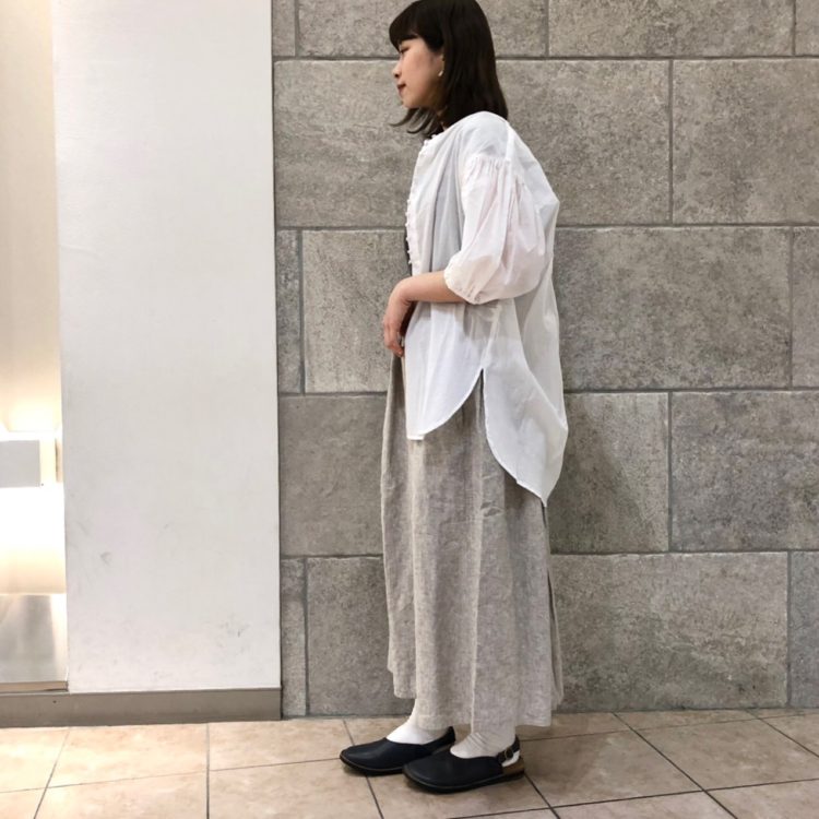 淡色ワントーンだと、ぼんやりして見えがちですが、ふんわりとボトムインをするとスタイルアップ!脚長効果もありますよ☆