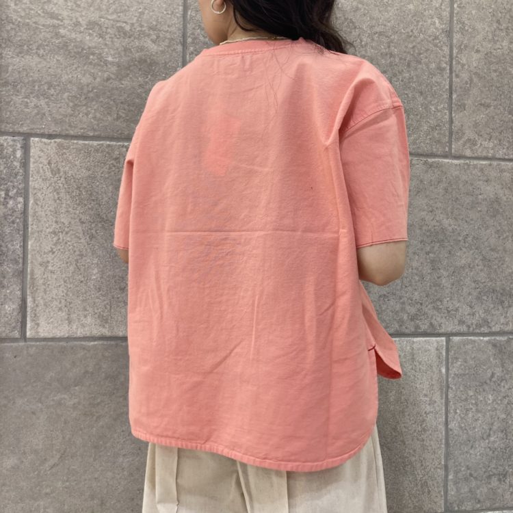 控えめなピンクなので潔くTシャツにパンツというシンプルスタイルにして、トップスのピンクをメインに。
