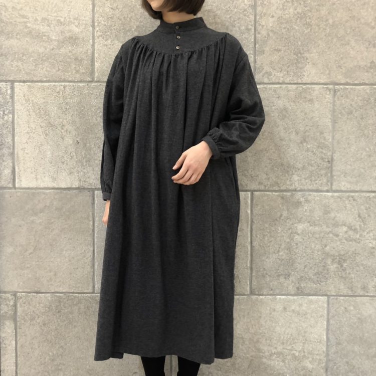 首元はハイネックで小さな3つボタンがポイント◎前後どちらもたっぷりとしたギャザーの切り替えが女性らしさがあります♪