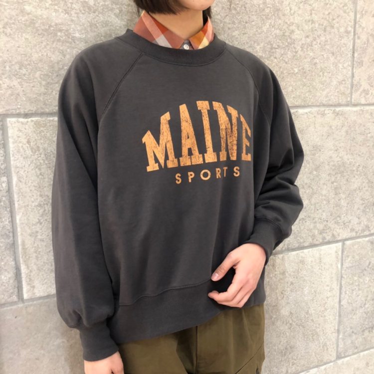 大きなカレッジロゴがポイントのプルオーバー。わざと擦れたロゴプリントがビンテージ感のある風合いに。裏毛なのでさらりと軽く、季節長く着られますよ!