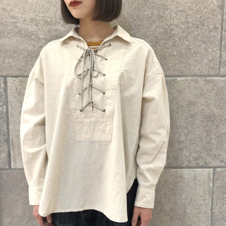 ワークシャツから着想したレースアップシャツ。ダブルステッチや裾の両脇にマチなど、カジュアルでメンズライクなディテールが特徴です!綿麻シャンブレーで涼しげな1枚♪