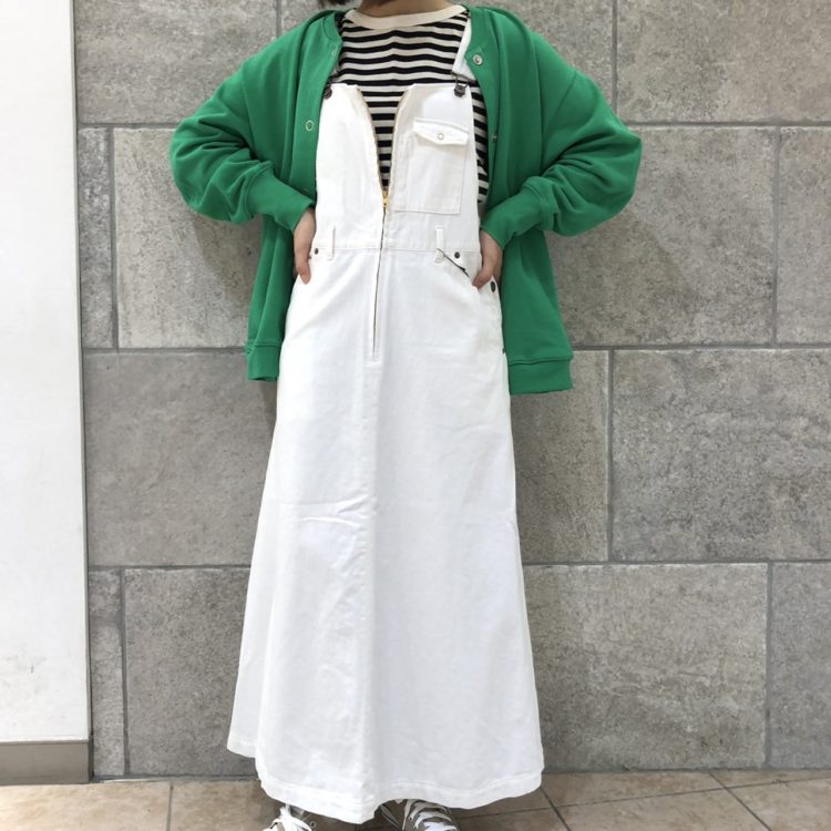 パキッと鮮やかなグリーンのカーディガンが主役のカジュアルスタイル。真っ白なジャンスカが女性らしさもあり爽やか♪チラ見えのボーダーが春夏らしさを演出しています。胸元のクリアメガネがさりげないアクセントに!ブラックの帽子で全体を引き締め◎