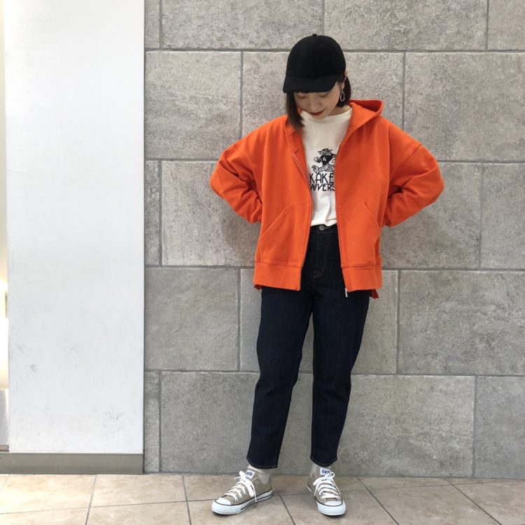 「フーディー×デニム」のカジュアルスタイルの定番を今年らしく、ビビッドカラーのオレンジで魅せる!落ち着いたベージュのコートとスニーカーで、コーデにメリハリを。トップスと帽子はモノトーンで合わせることで、フーディーの“オレンジ”が映えます◎