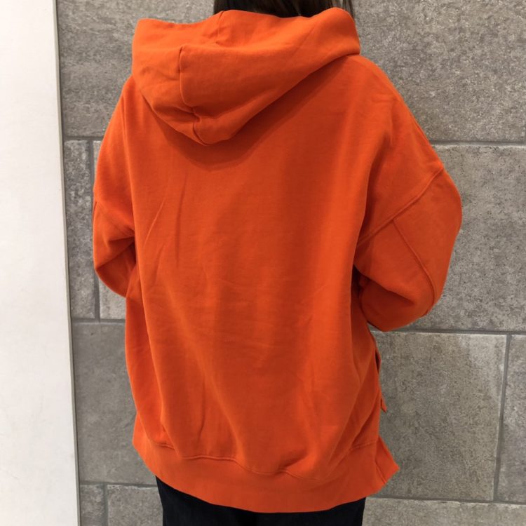 そして、大きなサイドスリットも特徴的!前後差のある着丈がお洒落。無地でシンプルなデザインだからこそ、スリットがポイントになりますね◎ちなみにこちらのフーディーも袖口のリブが長めです。